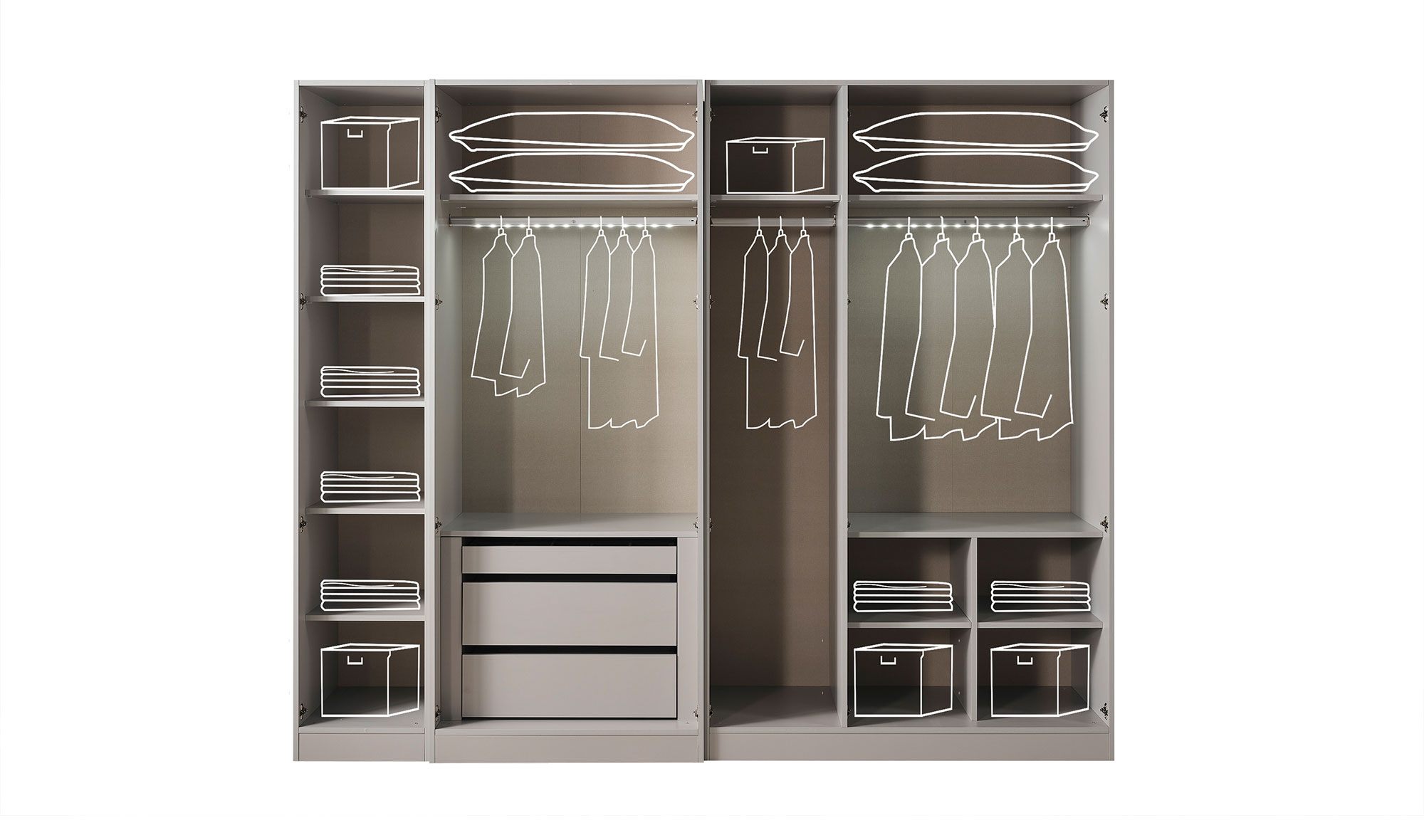 | Wardrobe Content | Hangers, shelves and drawers, led lighting |