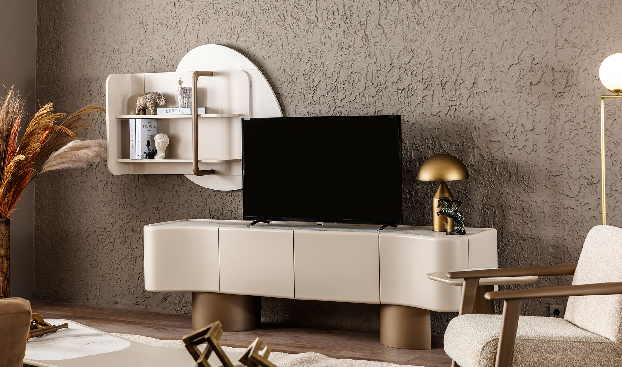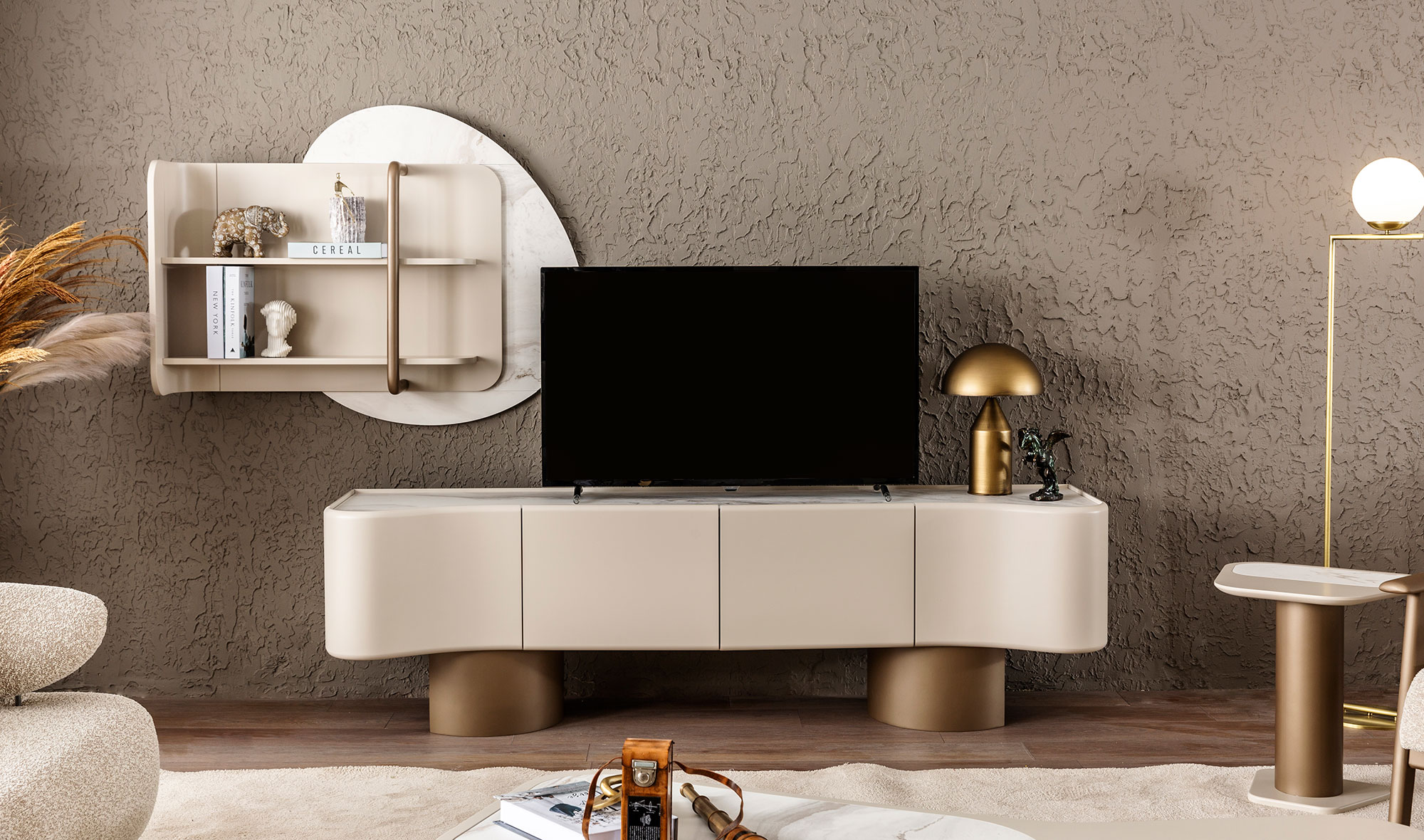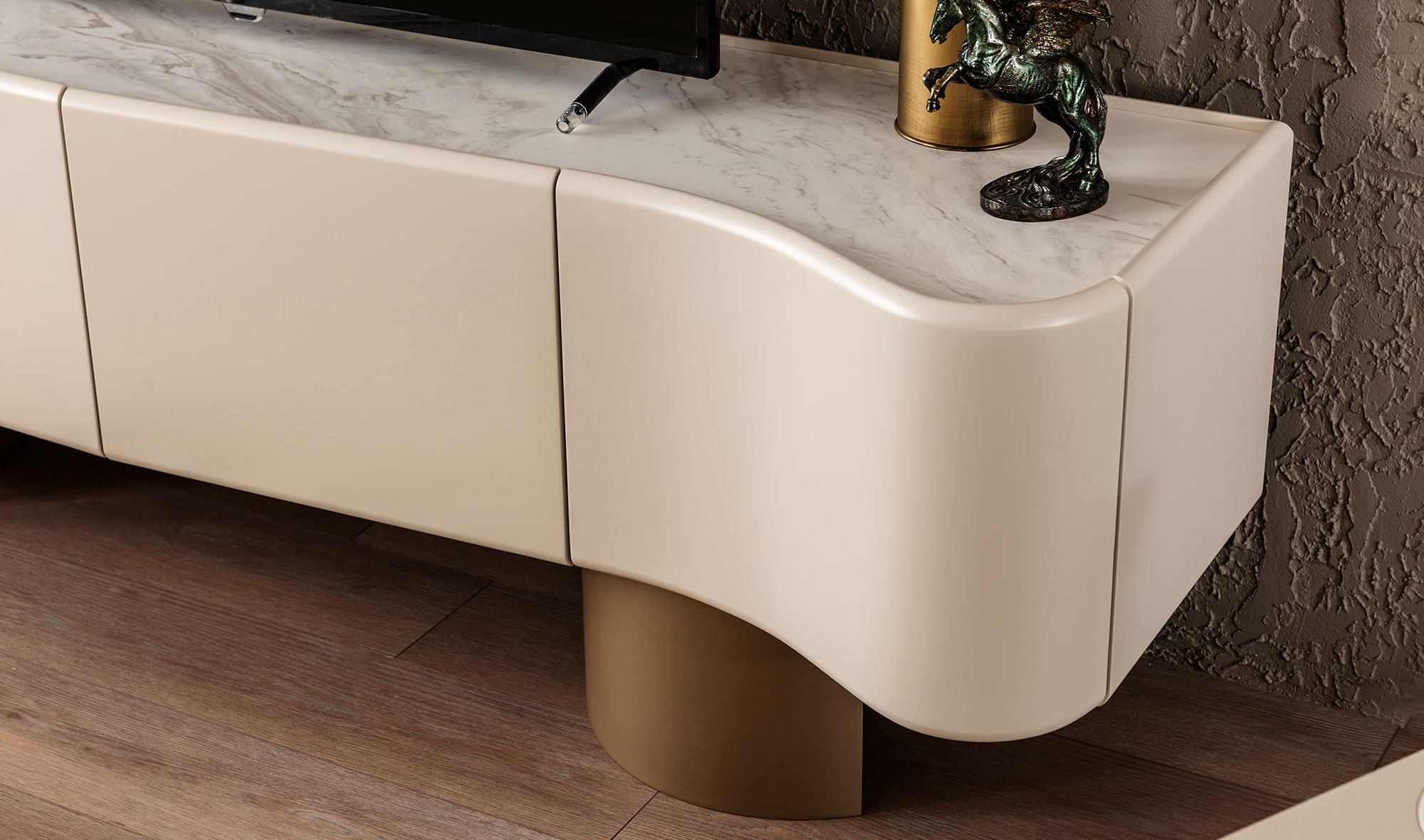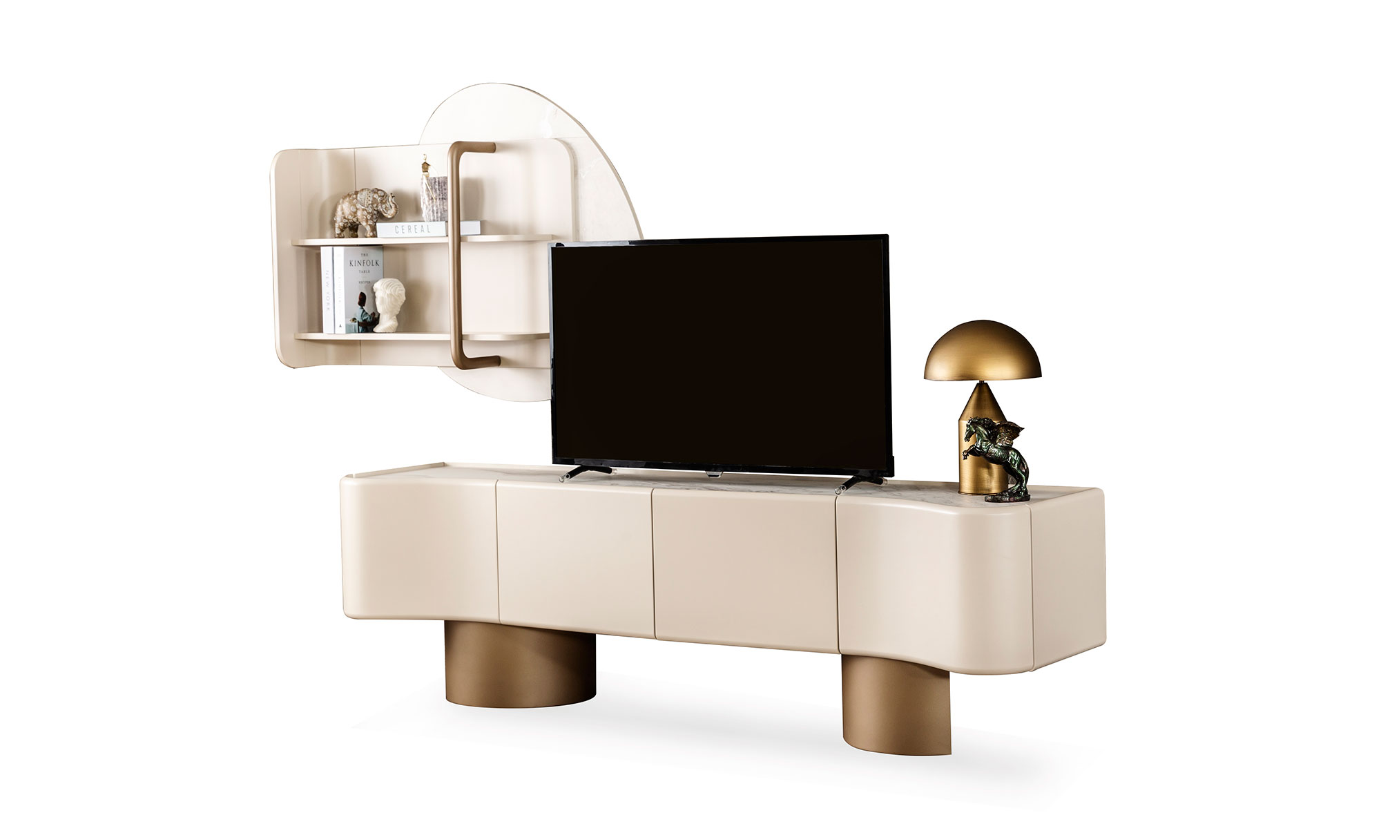 Tv unit with bottom lids and top shelf