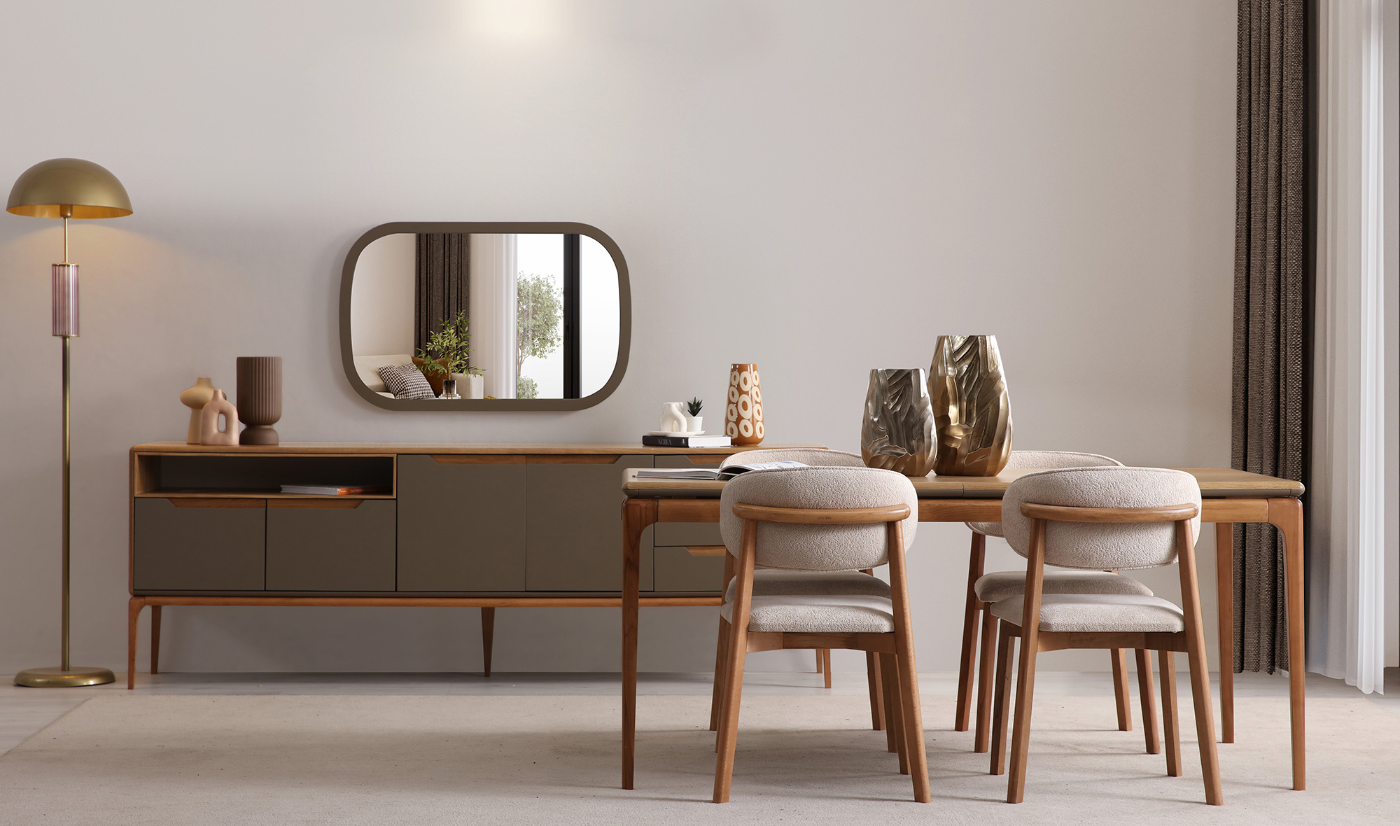 | Set Content | Console and mirror, dining table, 6 chairs |